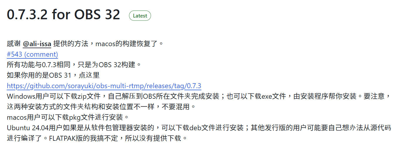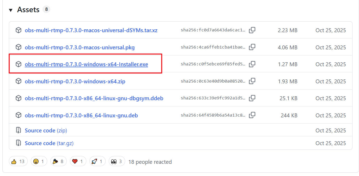 可以點此連結到 Github 下載 obs-multi-rtmp,可能因為 OBS 版本不同需要下載不同的外掛版本,請依照作者的說明下載即可。因為 zip 跟 install 的安裝方式不一樣,這邊建議直接下載 install.exe 安裝檔