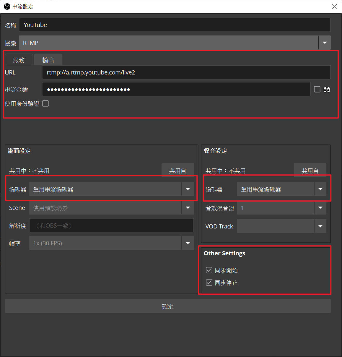 畫面與聲音的編碼器 都只要選擇「重用串流編碼器」即可
