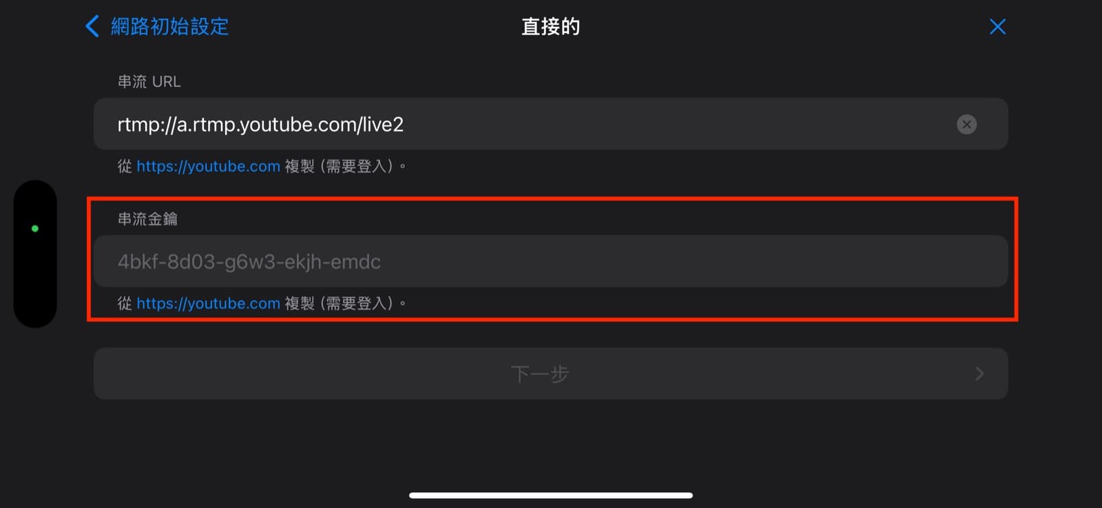 YouTube 的串流路徑 可以看上方 #取得金鑰與網址 這段,將從 YouTube 工作室取得的 URL 及串流金鑰 貼在下方的畫面設定中